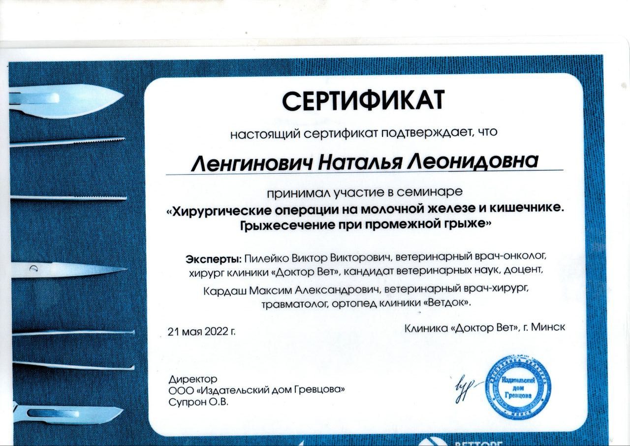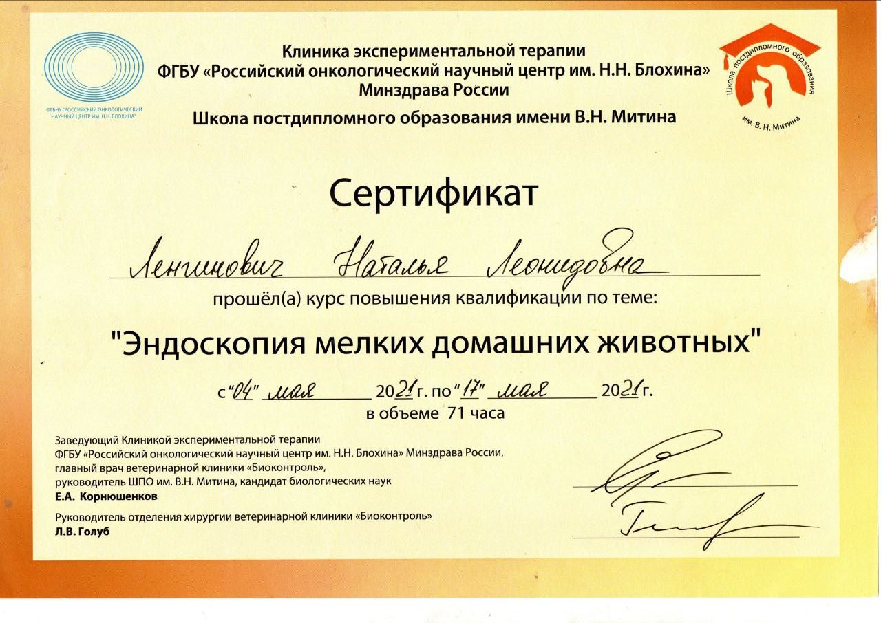 В 2021 году на базе Школы постдипломного образования имени В.Н. Митина, в клинике Биоконтроль г. Москва, пройден курс повышения квалификации по теме «Эндоскопия мелких домашних животных»
