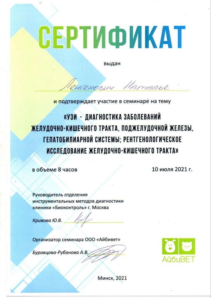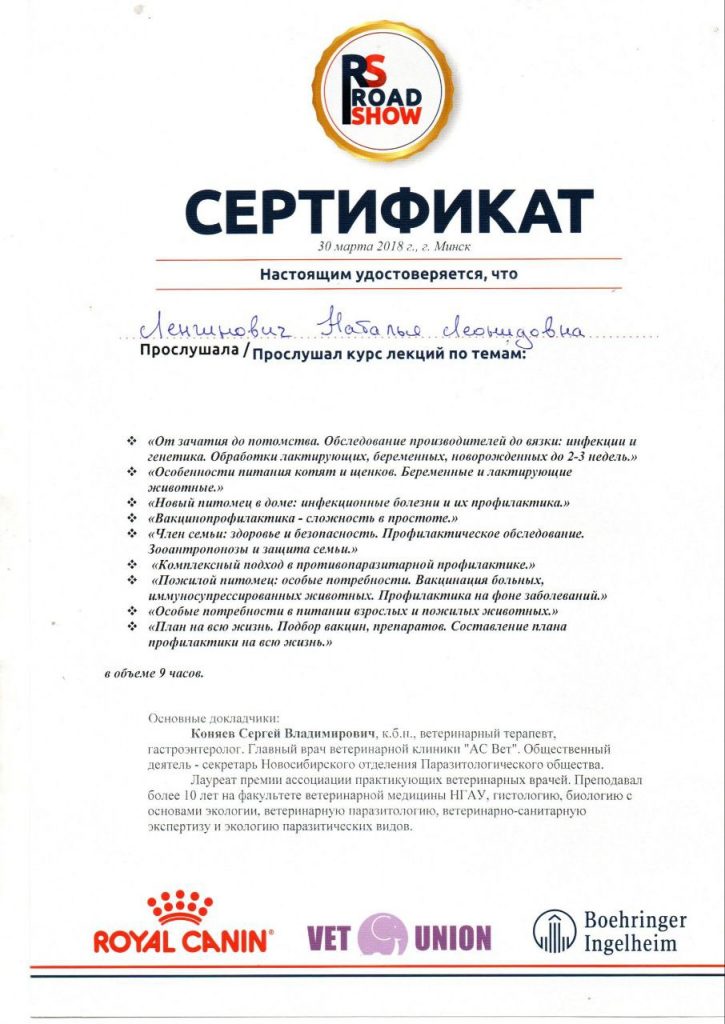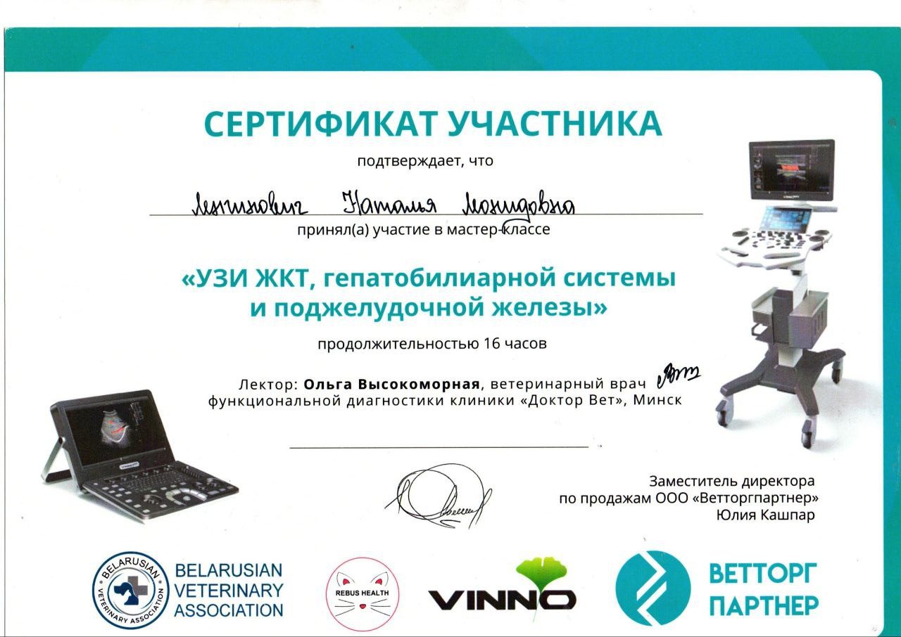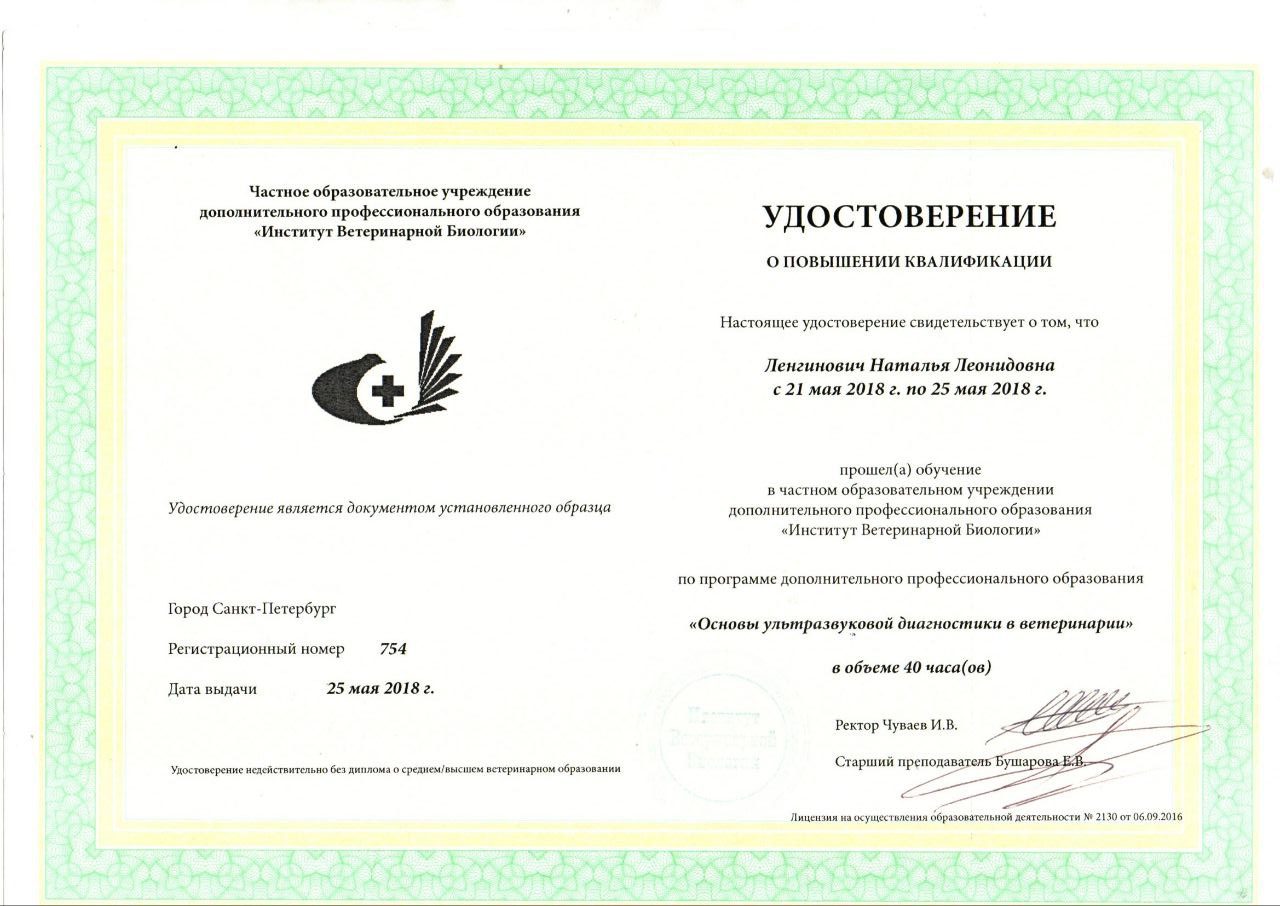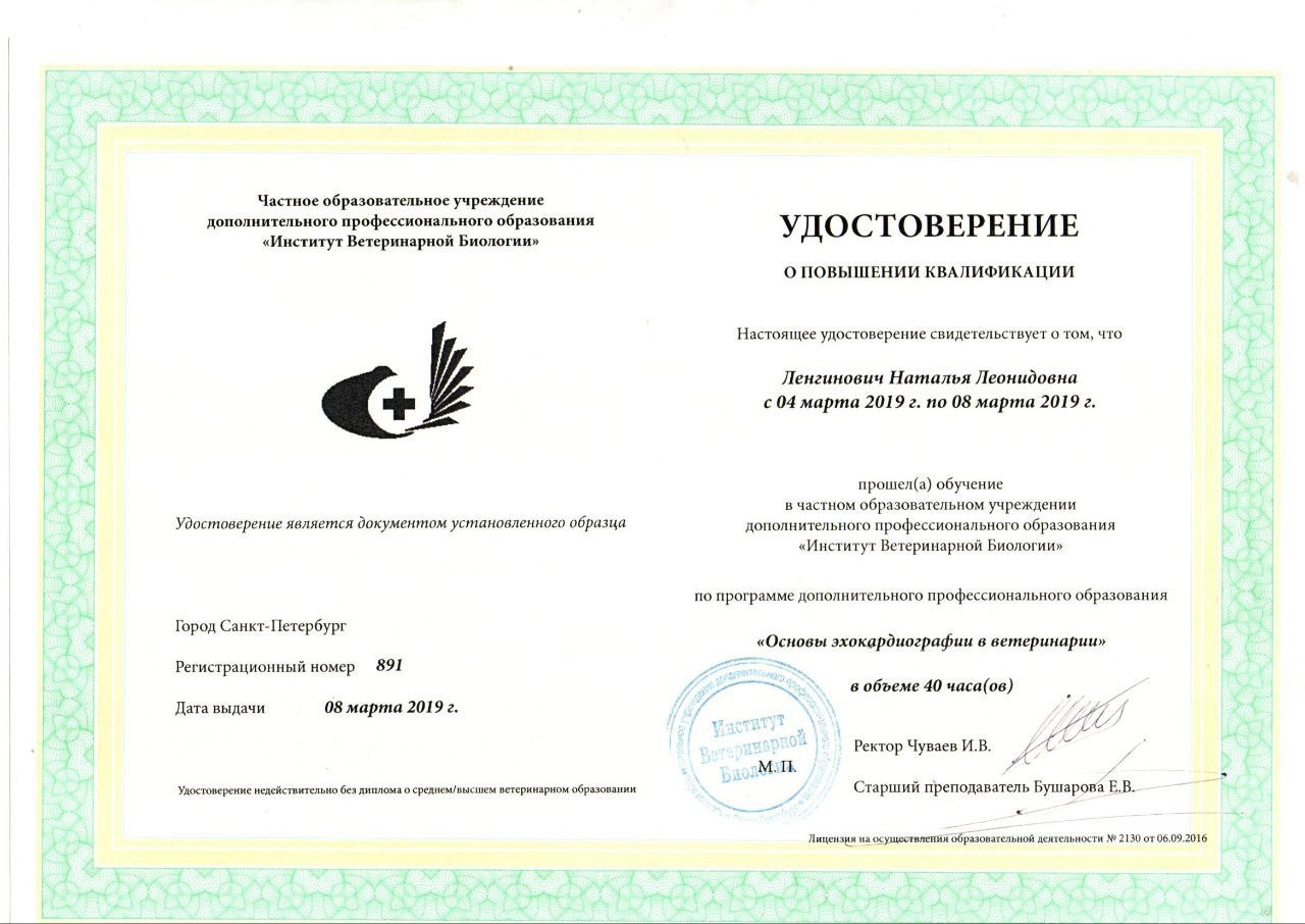 В 2018, 2019, пройдены курсы по УЗИ диагностики брюшной полости и ЭХО сердца, в Институте Ветеринарной Биологии г. Санкт-Петербург.