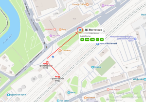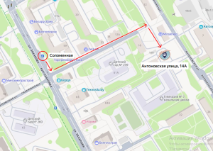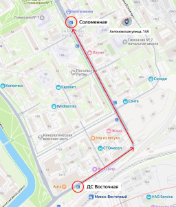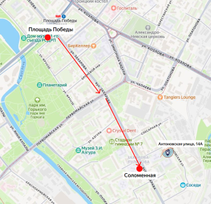Выход только один. Направо все время, мимо выходов из платформы. Платформа заканчиваются — снова направо и выходим из подземного перехода. Поворачиваем направо и идем до остановки 2-3 минуты вперед. Остановка «ДС Восточная», садимся на любой автобус, едем 2 остановки, на второй выходим, остановка «Соломенная». Не переходя дорогу, выходя с автобуса держимся правее. Проходим мимо детского сада и польского дома. За детский садом, дом №16, за ним направо во дворы. Затем прямо. Вы на месте.