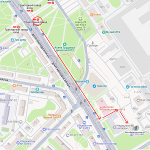 Выход из метро: остановка транспорта, Долгобродская улица. Идем прямо, вдоль дороги мимо бассейна «Трактор», между Детской поликлиникой №9 и Медицинским колледжем поворачиваем налево. Идем прямо до железных ворот пожарной станции. Поворачиваем направо на парковку, проходим ее. Обходим здание с левой стороны (обратная сторона здания). Вы на месте.