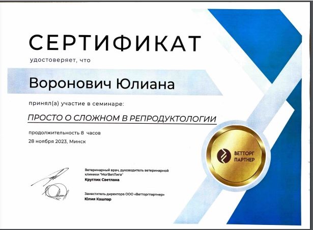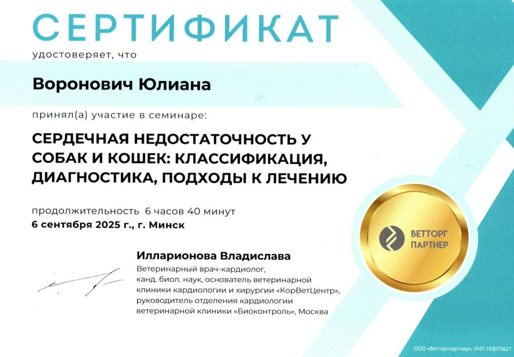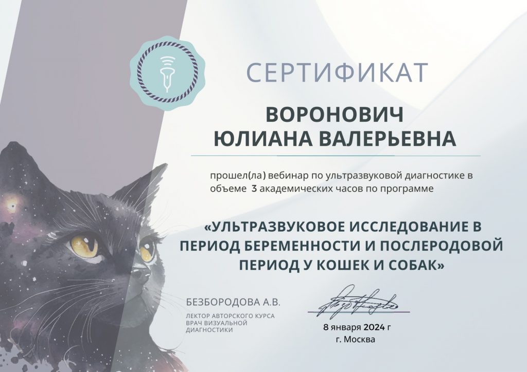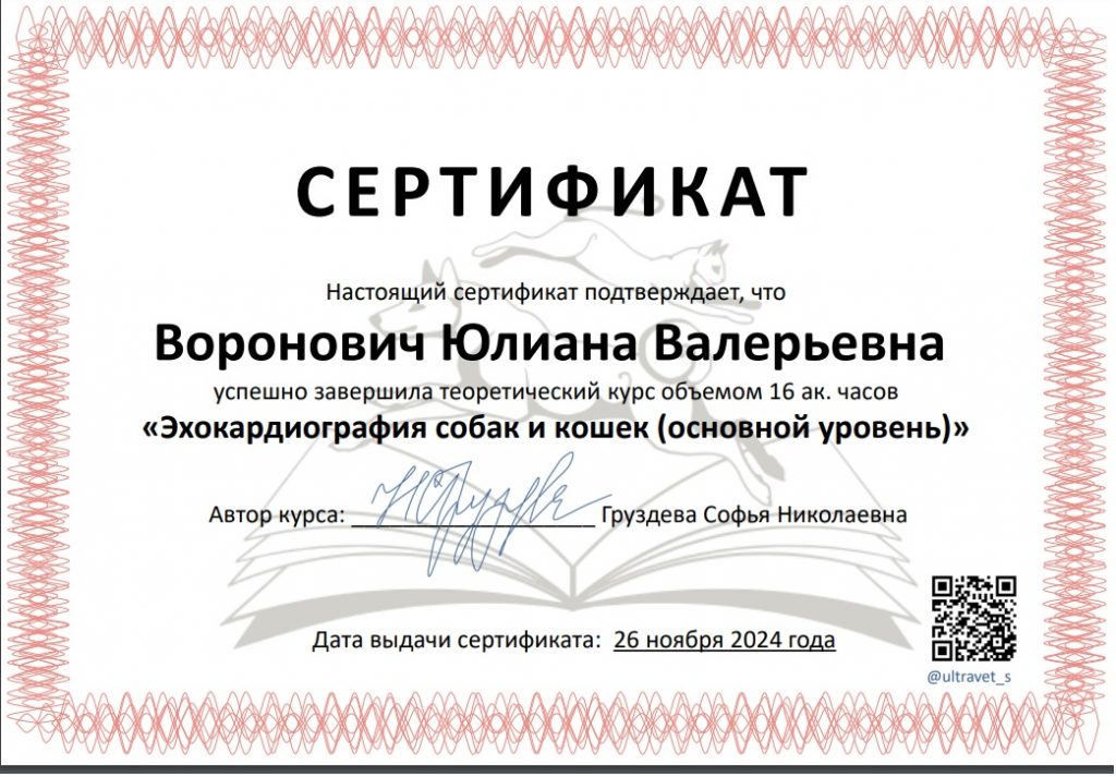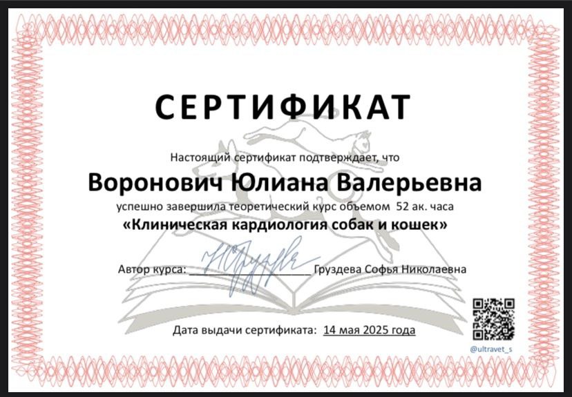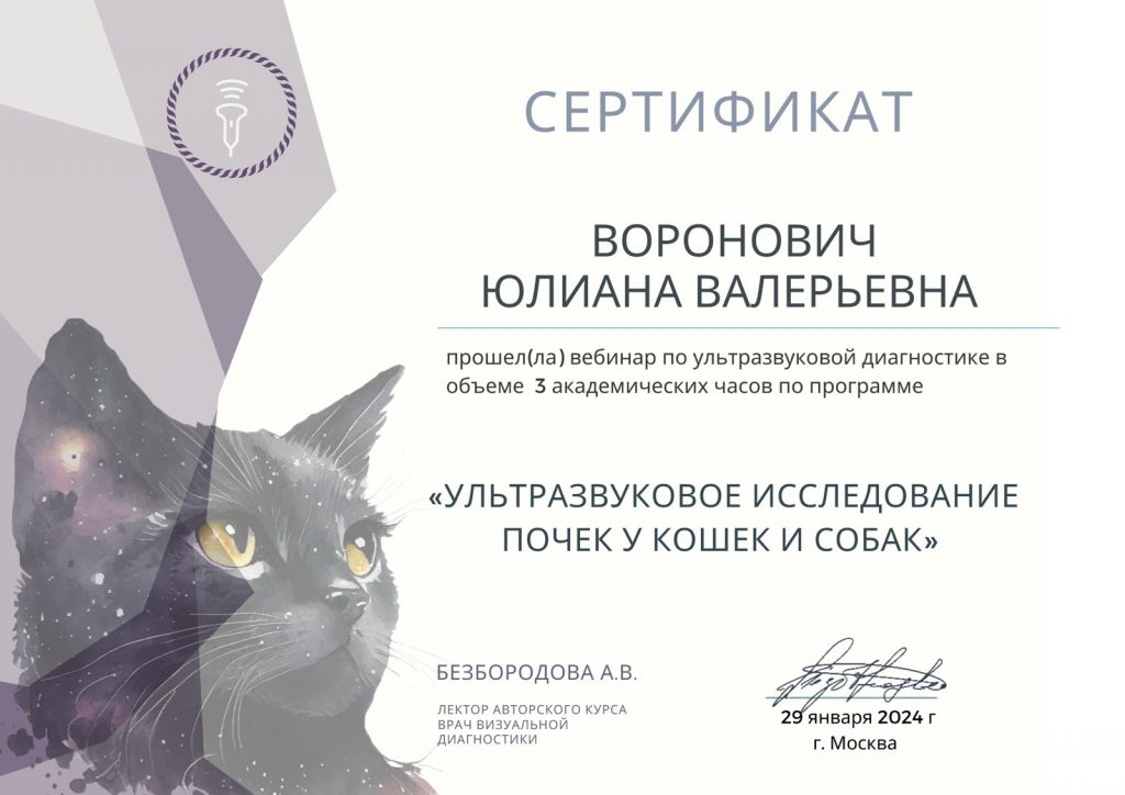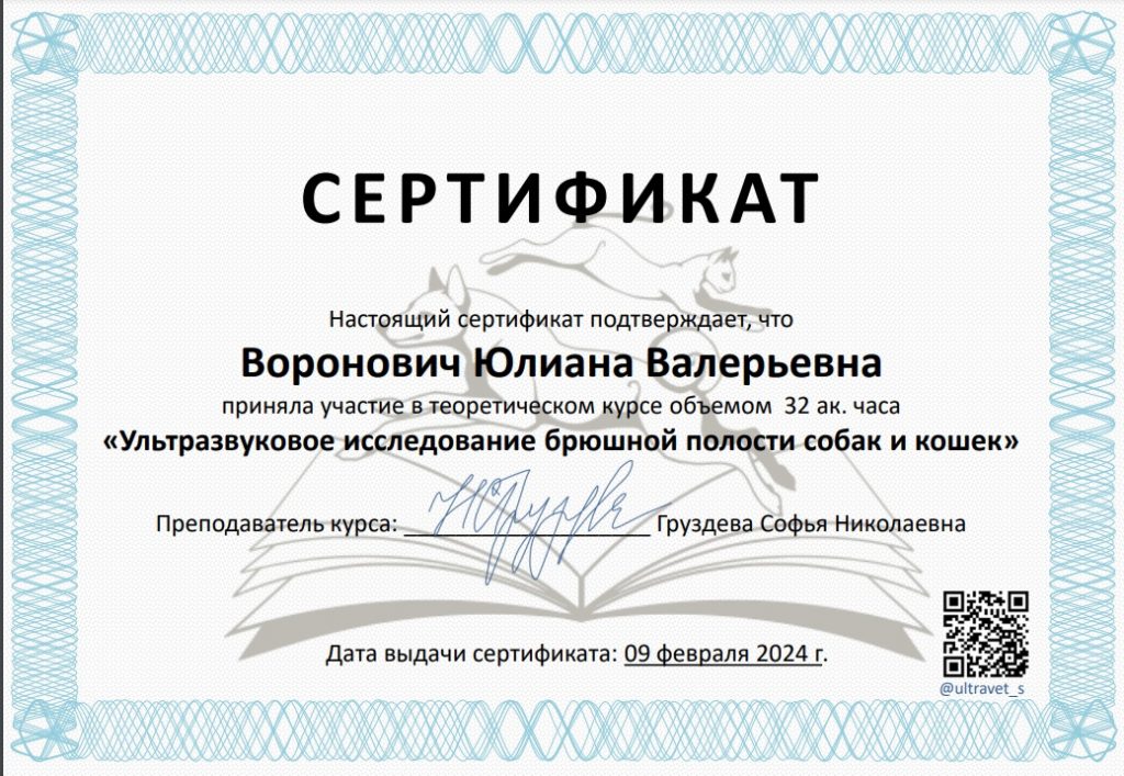 В 2024 году окончила ветеринарную школу «Ультраветс» курс «Расширенное ЭХО кошек и собак», г. Москва.