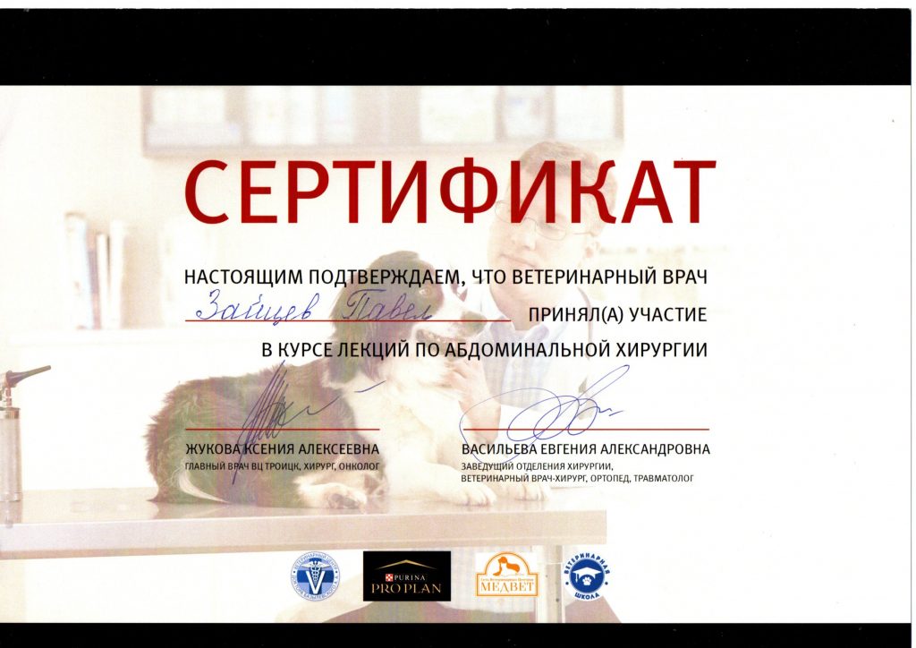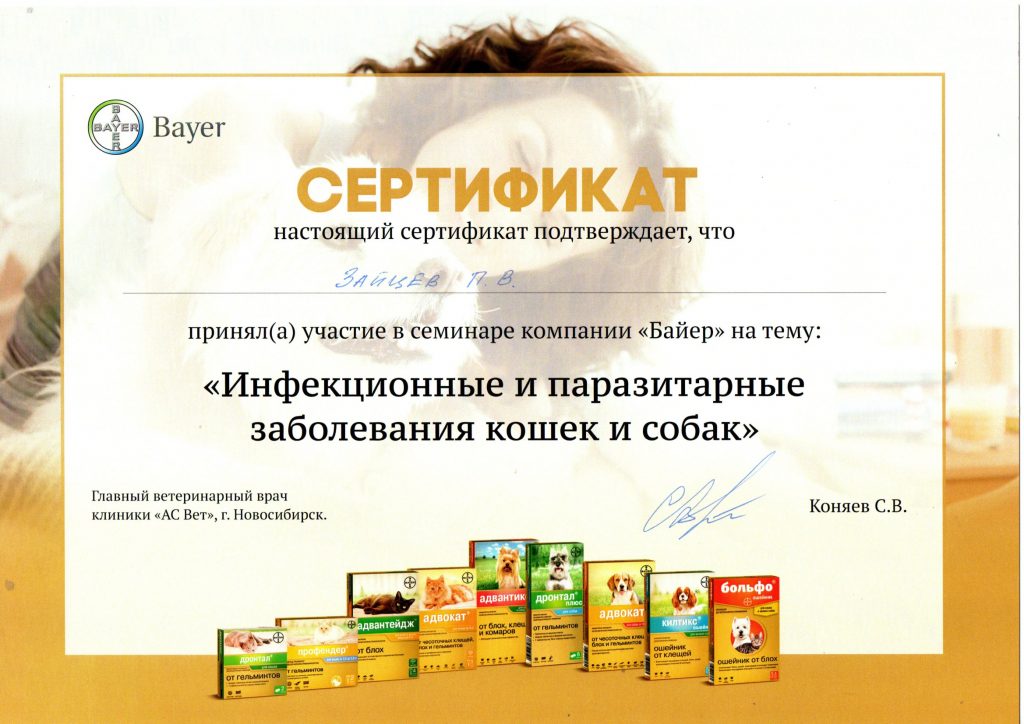 2016 год – принял участие в семинаре компании «Bayer» на тему «Инфекционные и паразитарные заболевания собак и кошек»