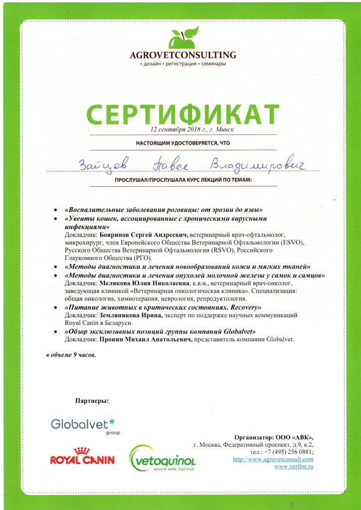 12 сентября 2018 года, г. Минск — прослушал курс лекций по темам: «Воспалительные заболевания роговицы: от эрозии до язвы», «Увеиты кошек, ассоциированные с хроническими вирусными инфекциями», «Методы диагностики и лечения новообразований кожи и мягких тканей», «Методы диагностики и лечения опухолей молочной железы у самок и самцов», «Питание животных в критических состояниях. Recovery», «Обзор эксклюзивных позиций группы компаний Globalvet».