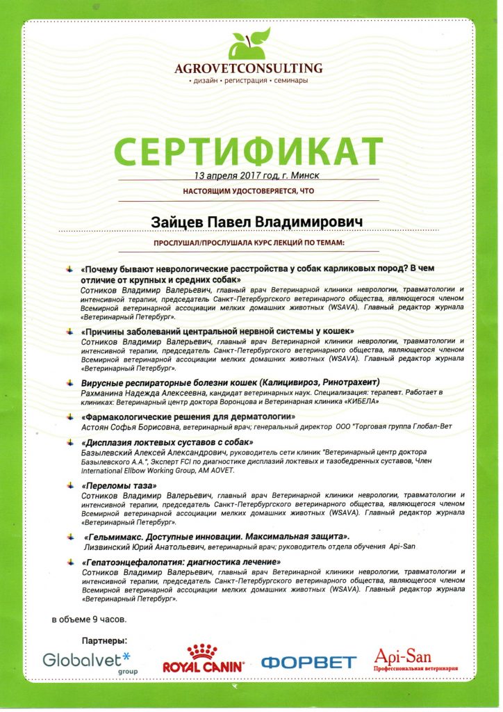 13 апреля 2017 года, г. Минск – прослушал курс лекций по темам: «Почему бывают неврологические расстройства у собак карликовых пород? В чем отличие от крупных и средних собак», «Причины заболеваний центральной нервной системы у кошек», «Вирусные респираторные болезни кошек (Калицивироз, Ринотрахеит», «Фармакологические решения для дерматологии», «Дисплазия локтевых суставов у собак», «Переломы таза», «Гельмимакс. Доступные инновации. Максимальная защита», «Гепатоэнцефалопатия: диагностика и лечение».